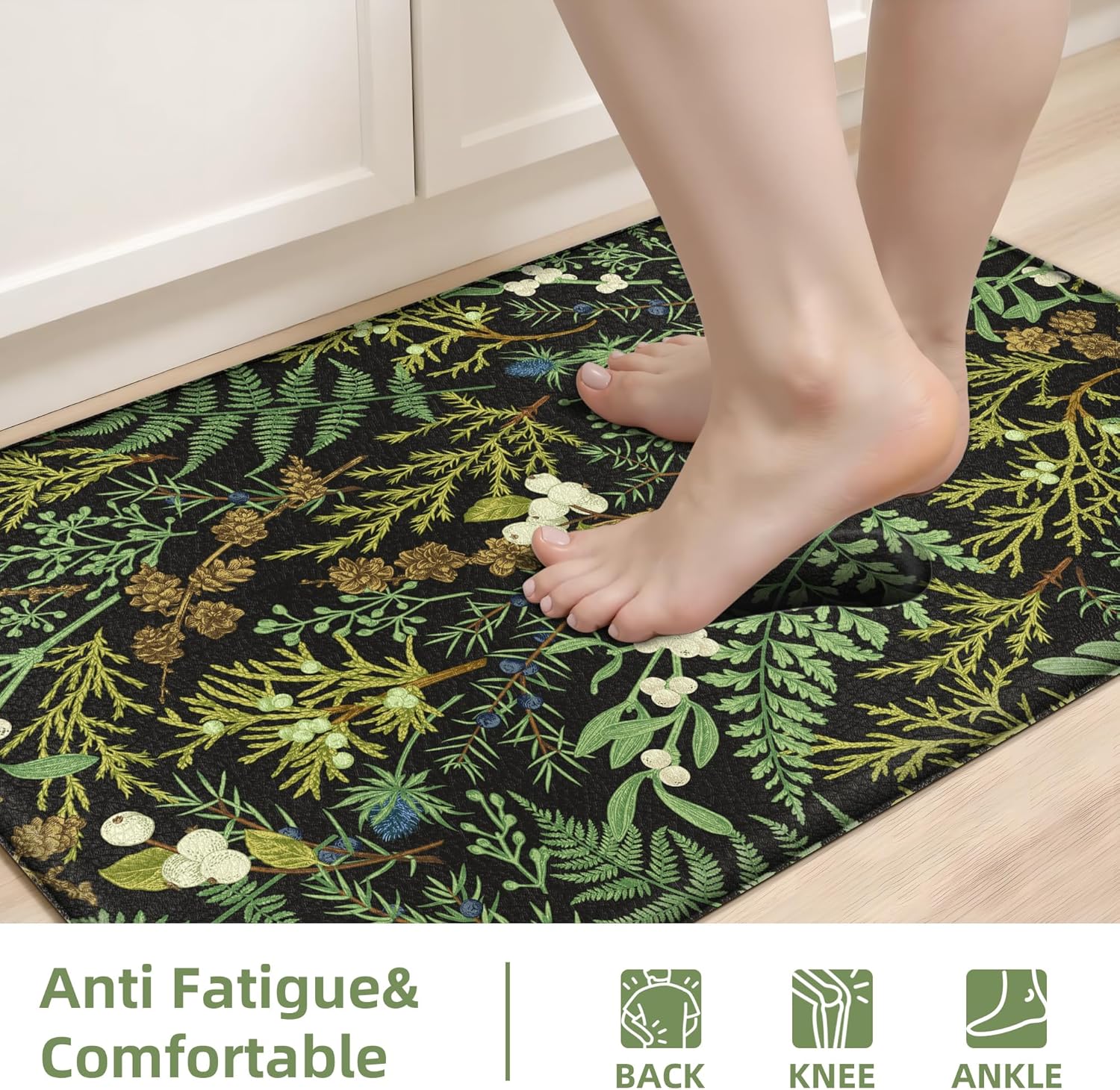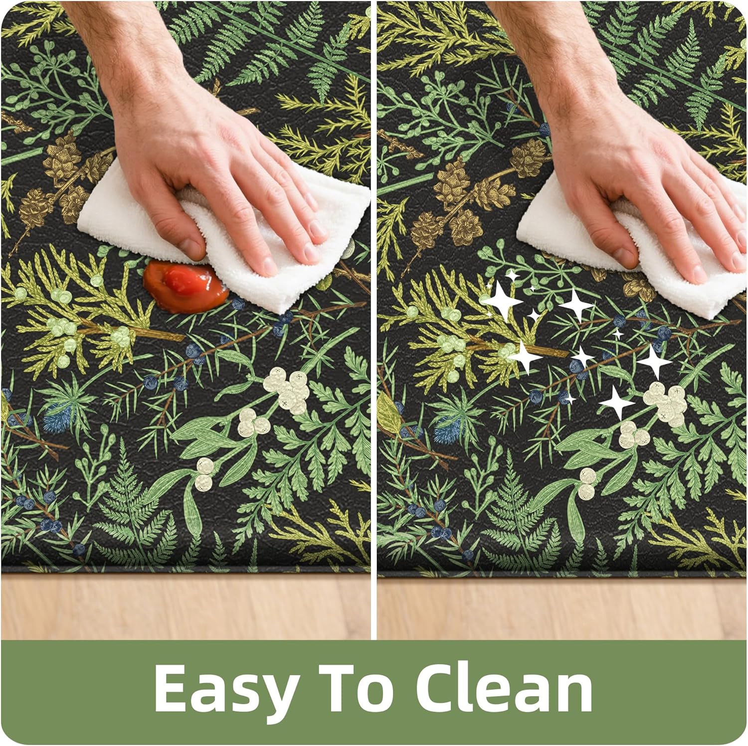 Black Green Botanical Kitchen Rugs Set of 2 Plant Leaf Anti-Fatigue Kitchen Mat Natural Comfort Standing Waterproof PVC Mats 2/5" Thick Leather Carpet for Laundry Office Sink(17.3" x28" + 17.3" x 59")